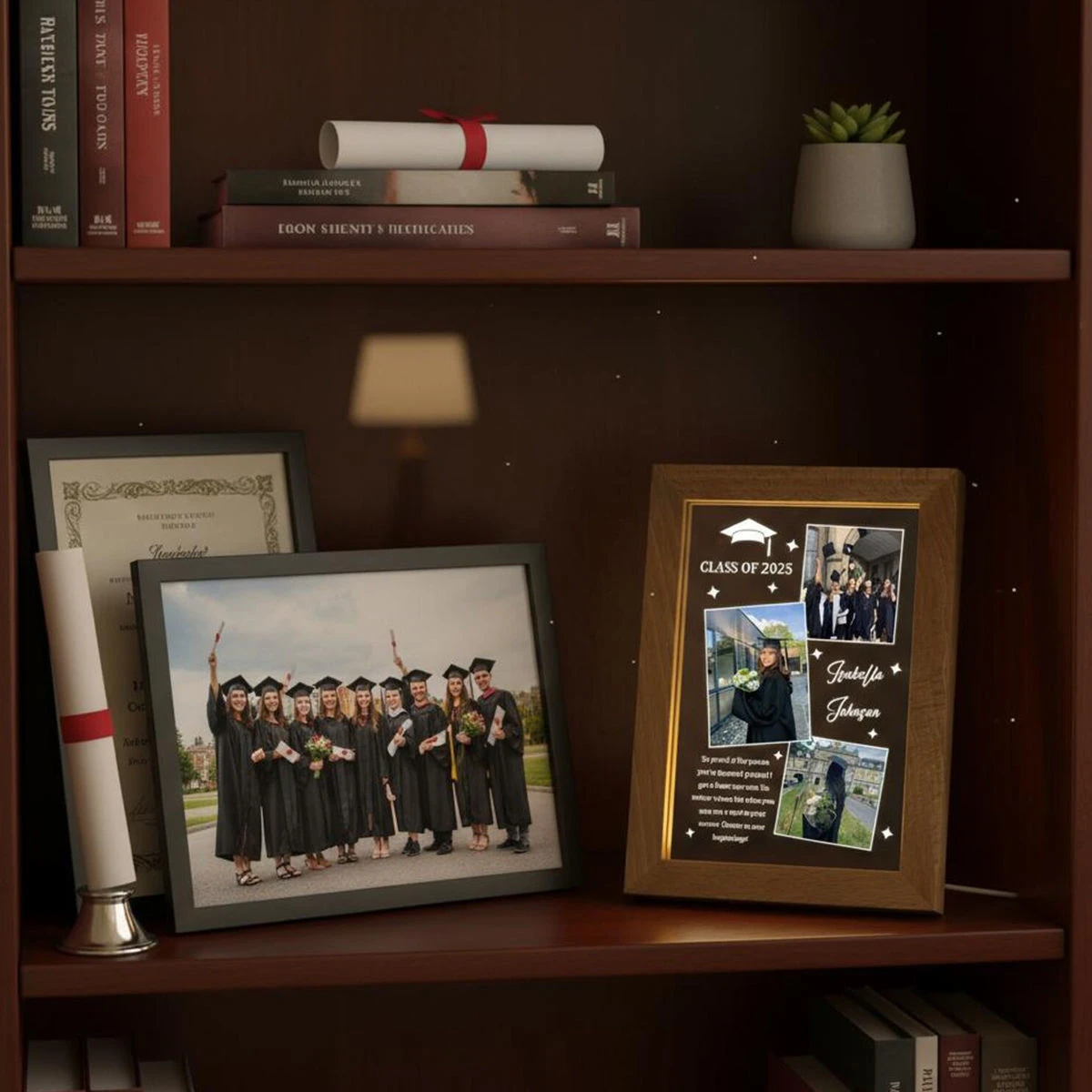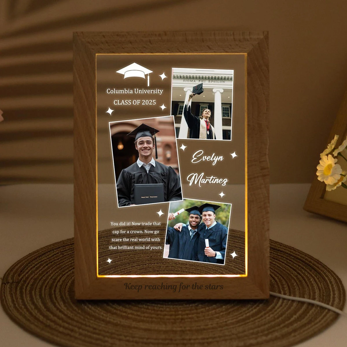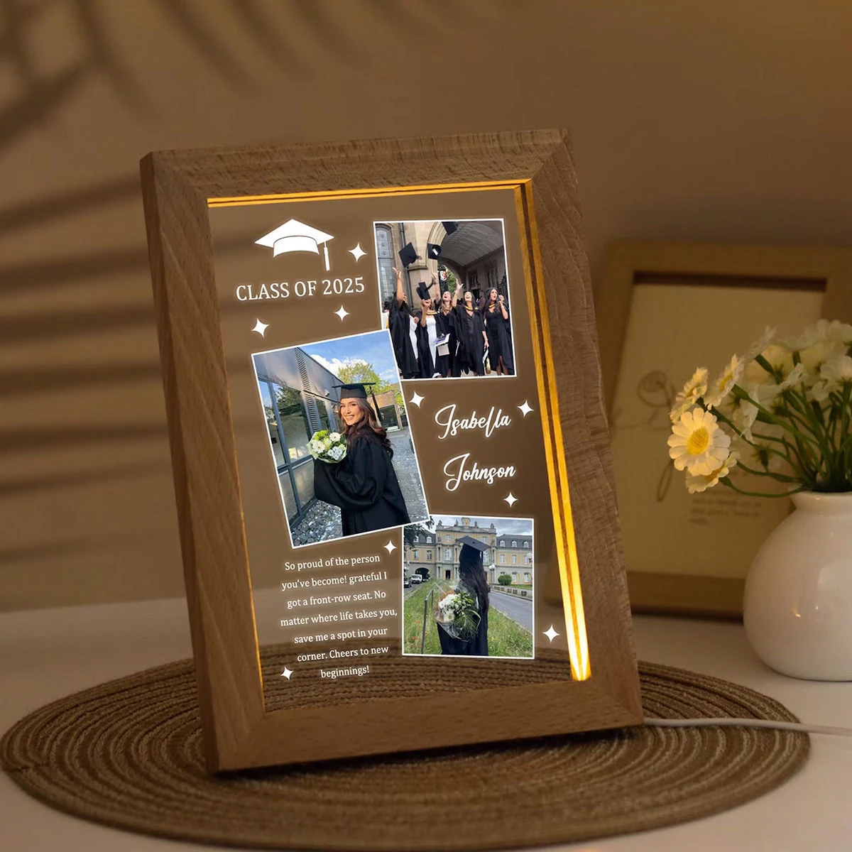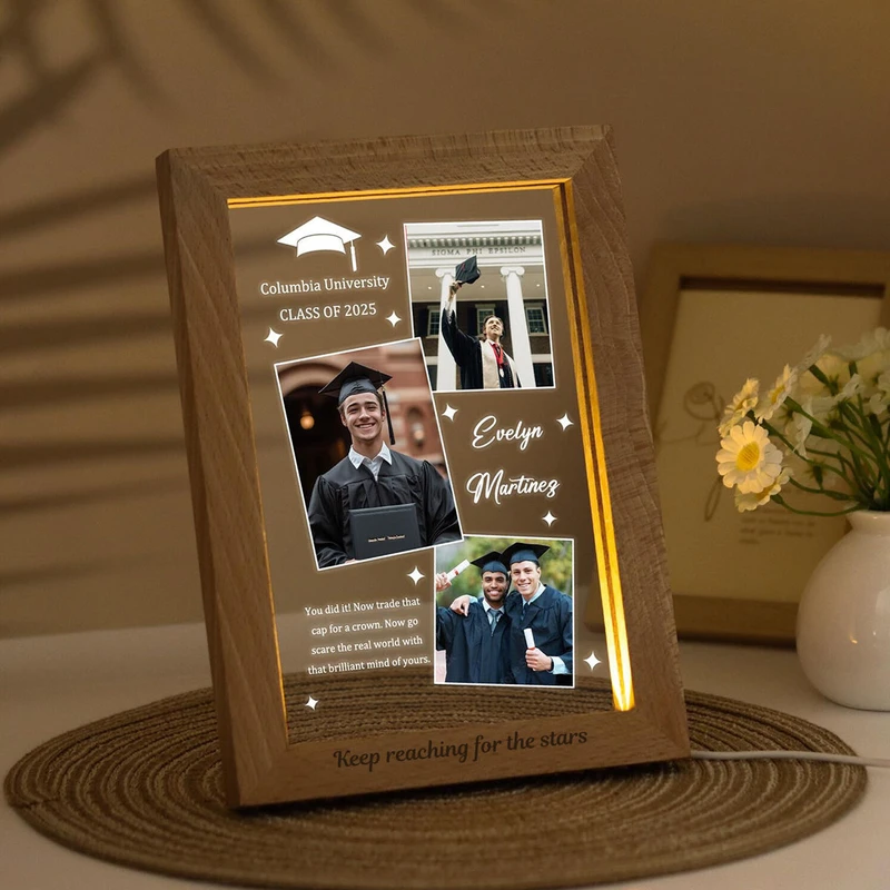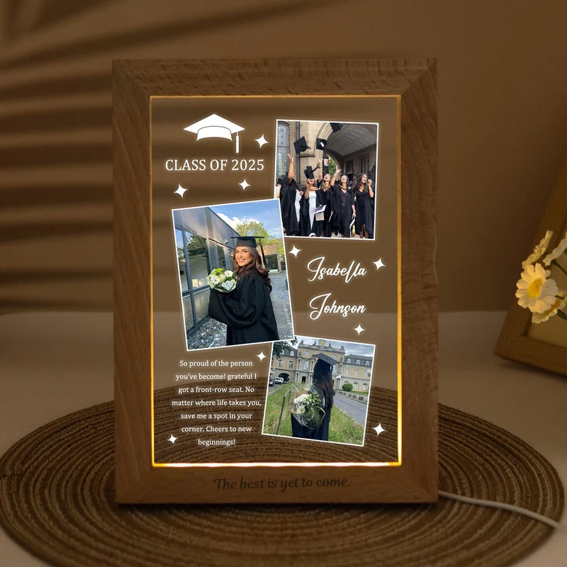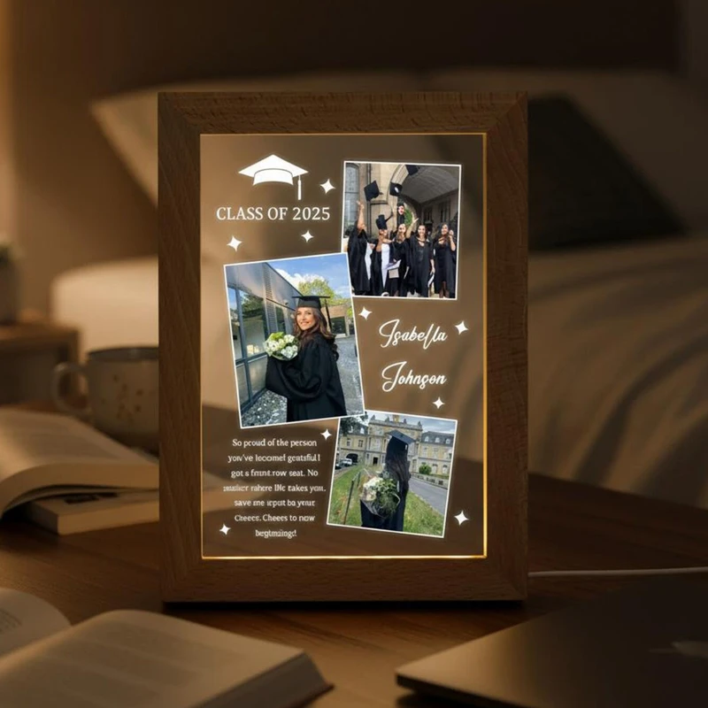 A personalized graduation night light featuring a wooden base and custom acrylic photo frame for the Class of 2026.